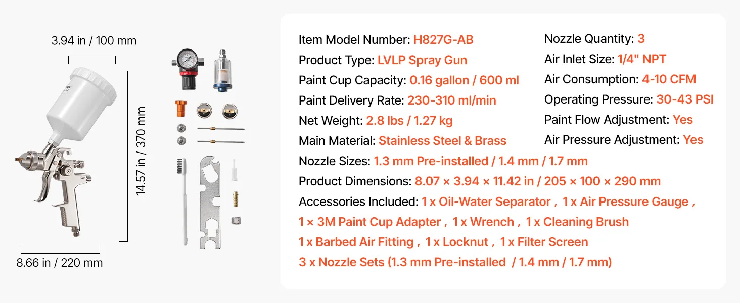 Zeer efficiënt spuiten: het VEVOR LVLP-verfspuitpistool lost de HVLP-problemen op die gepaard gaan met een hoge luchtcompressorbehoefte en een relatief lage spuitsnelheid. Tegelijkertijd blijft de verfbenutting hoog (doorgaans ≥ 70%) en kunnen grote oppervlakken gemakkelijk worden gespoten.