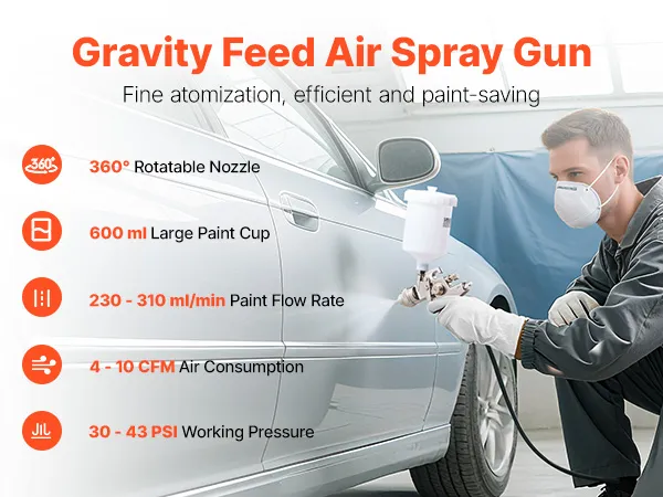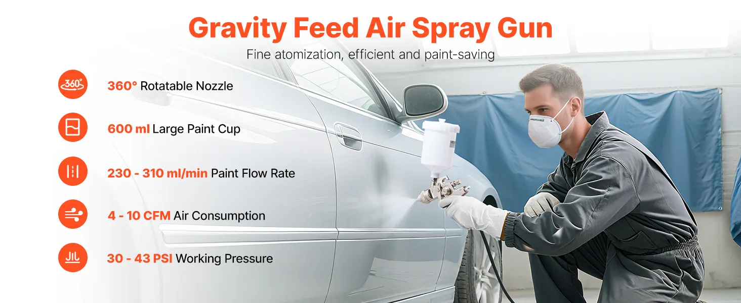 Het verfspuitpistool met zwaartekrachttoevoer is voorzien van een 360° draaibare spuitmond en drie onafhankelijke knoppen om het spuitpatroon, de verfstroom en het luchtvolume te regelen. Zo krijgt u gladde, gelijkmatige lagen voor uiteenlopende verfbehoeften.