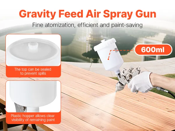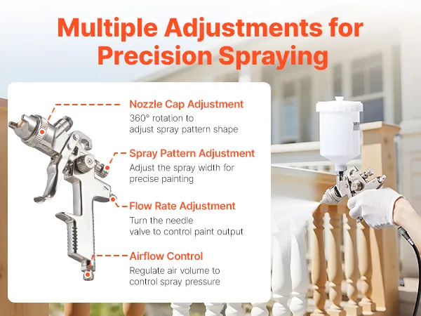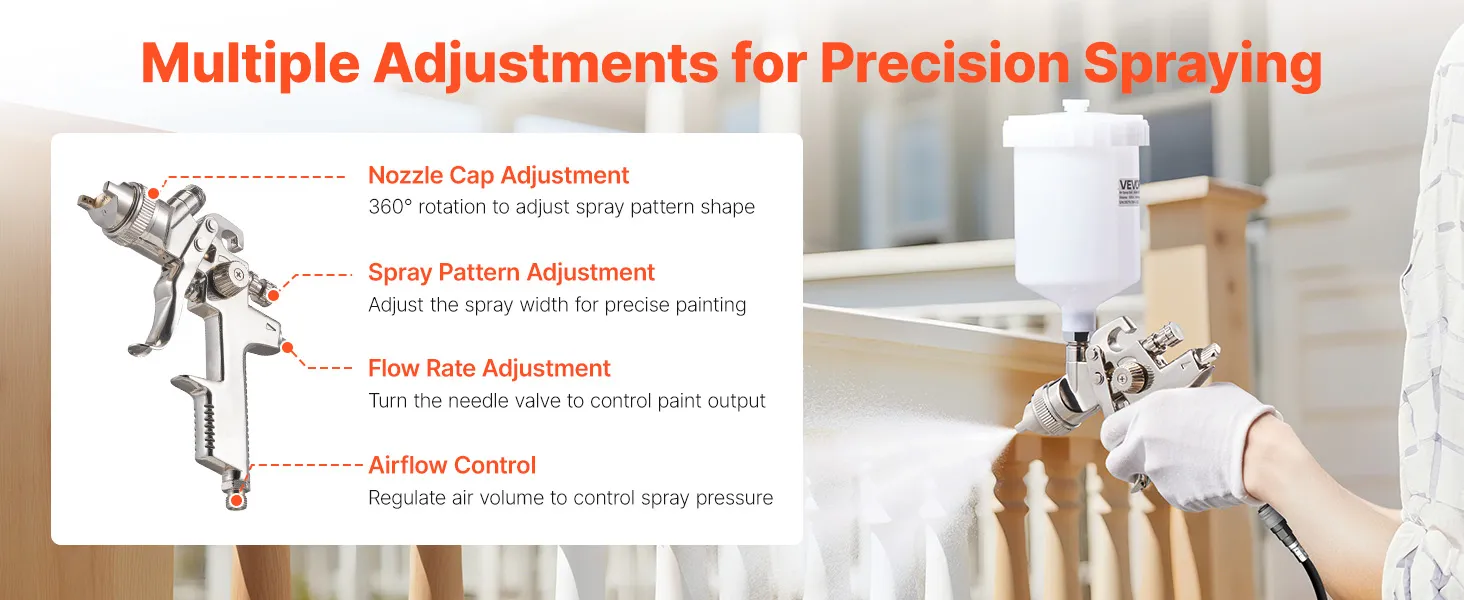 Flexibele aanpassingen: Uitgerust met een 360° draaibare spuitmondkap en drie onafhankelijke knoppen voor het aanpassen van het spuitpatroon, de verfstroom en het luchtvolume, biedt dit zwaartekrachtgevoede verfspuitpistool nauwkeurige controle voor verschillende spuitvereisten