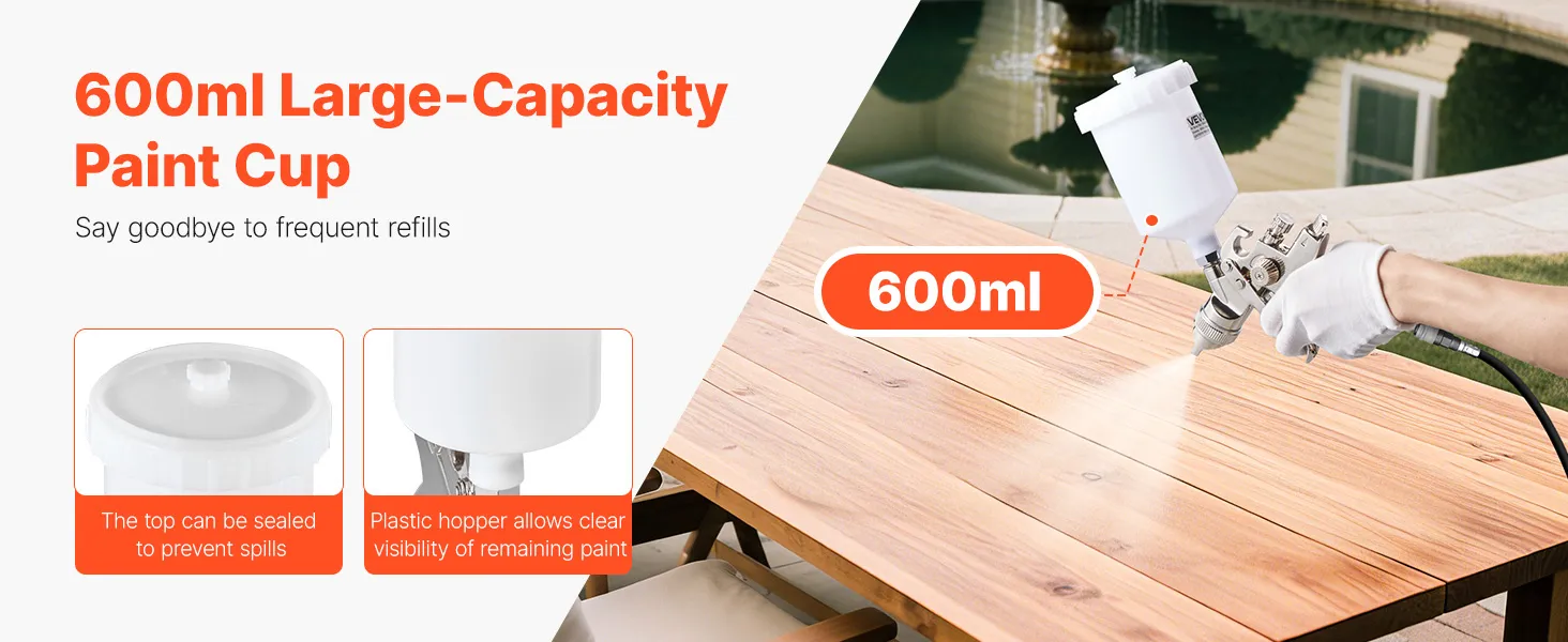 Dankzij de grote inhoud van 600 ml (20 oz) hoeft u de verfbeker minder vaak bij te vullen en kunt u langer en ononderbroken spuiten, voor consistentere, gelijkmatigere en efficiëntere resultaten.