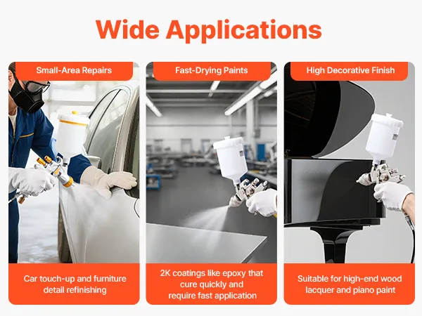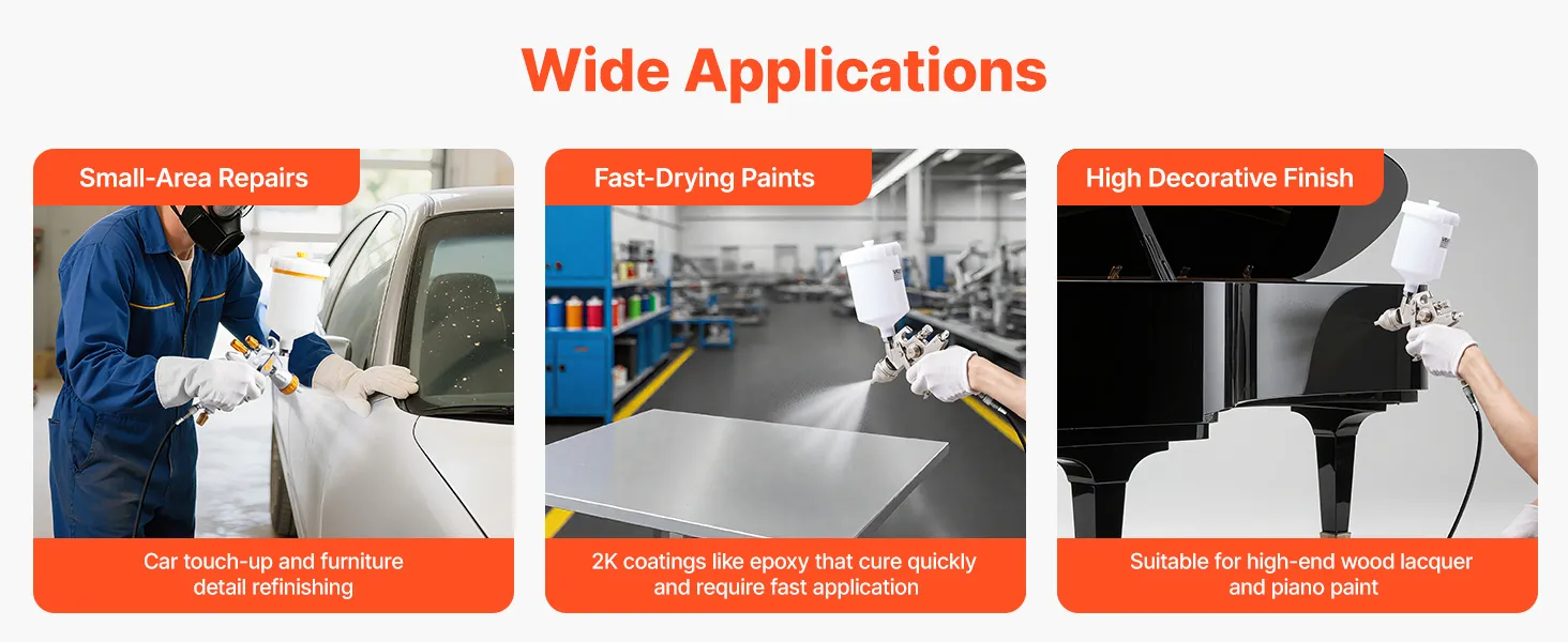 Breed scala aan toepassingen: Het LVLP-spuitpistool is ideaal voor spuitklussen waarbij snelheid en kwaliteit voorop staan (bijv. primers en verflagen) en voor werk op grote oppervlakken. Het is de eerste keuze voor gebruikers met een beperkt budget of kleinere compressoren (bijv. doe-het-zelvers, kleine werkplaatsen).