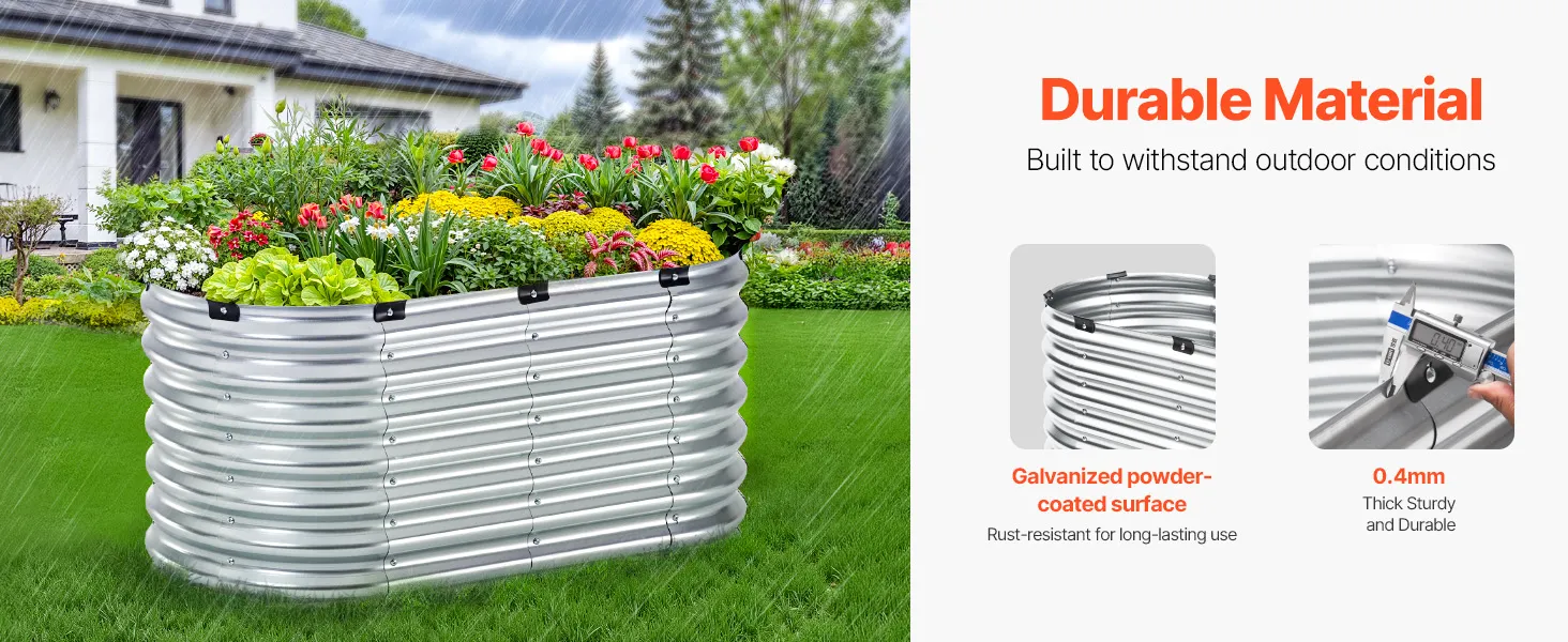 Sturdy and Durable: This metal raised garden bed is constructed with 0.4mm thick metal side panels. The surface is coated with galvanized powder for rust and corrosion resistance, ensuring long-term use in outdoor environments. Get ready to tackle the outdoors with confidence!