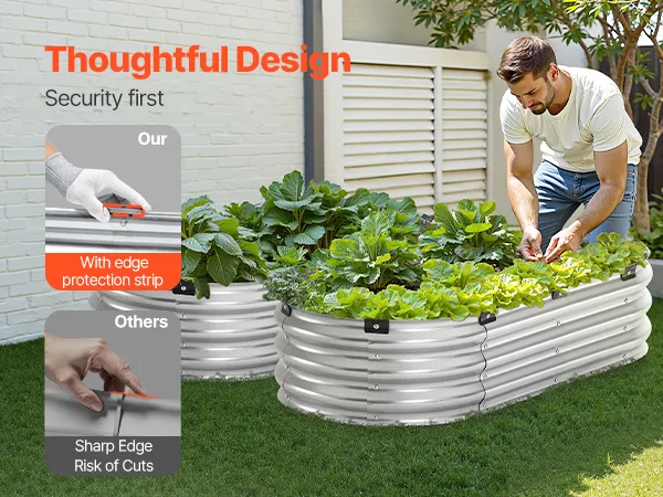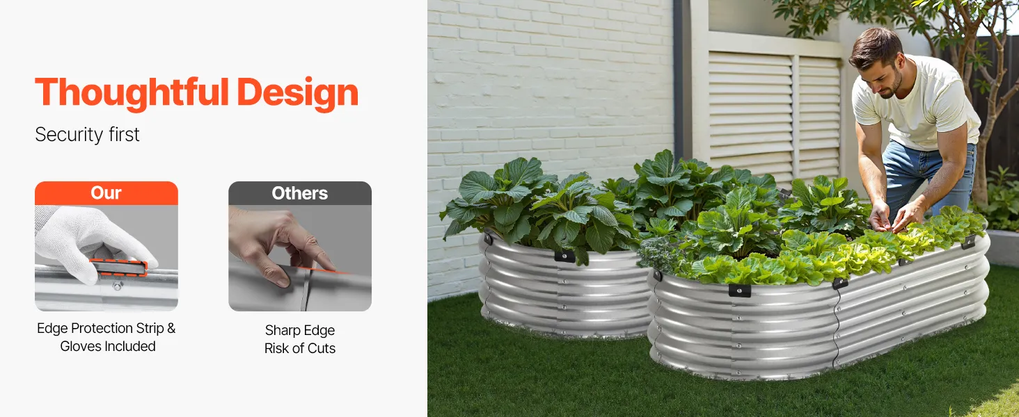 Secure to Use: To ensure your safety during use, our raised planter box features rolled edges with edge protectors, and we include a pair of gloves to protect your hands from scratches. Enjoy worry-free gardening with this thoughtful design.