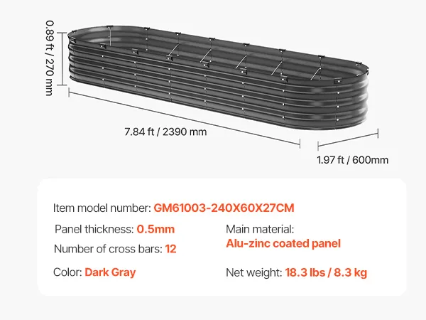 VEVOR Metal Raised Garden Bed, 8 x 2 x 1 ft Outdoor Galvanized Planter Box, with Open Bottom, Large Oval Planter Raised Bed for Gardening Vegetables, Flowers, Herbs, and Succulent Plants, Dark Gray