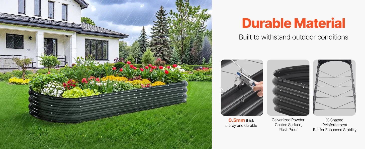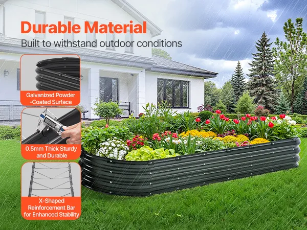 Sturdy and Durable: This metal raised garden bed is constructed with 0.5mm thick metal side panels. The surface is coated with galvanized powder for rust and corrosion resistance, ensuring long-term use in outdoor environments. The 20 internal X-shaped reinforcement bars provide extra stability, preventing the bed from toppling in strong winds. Get ready to tackle the outdoors with confidence!