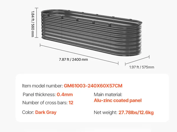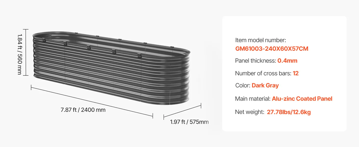 VEVOR metalen verhoogde bak, 240x60x56cm, gegalvaniseerde buitenbak met open bodem, plantbak, ovaal groentebed voor het kweken van groenten, bloemen, kruiden en vetplanten, donkergrijs