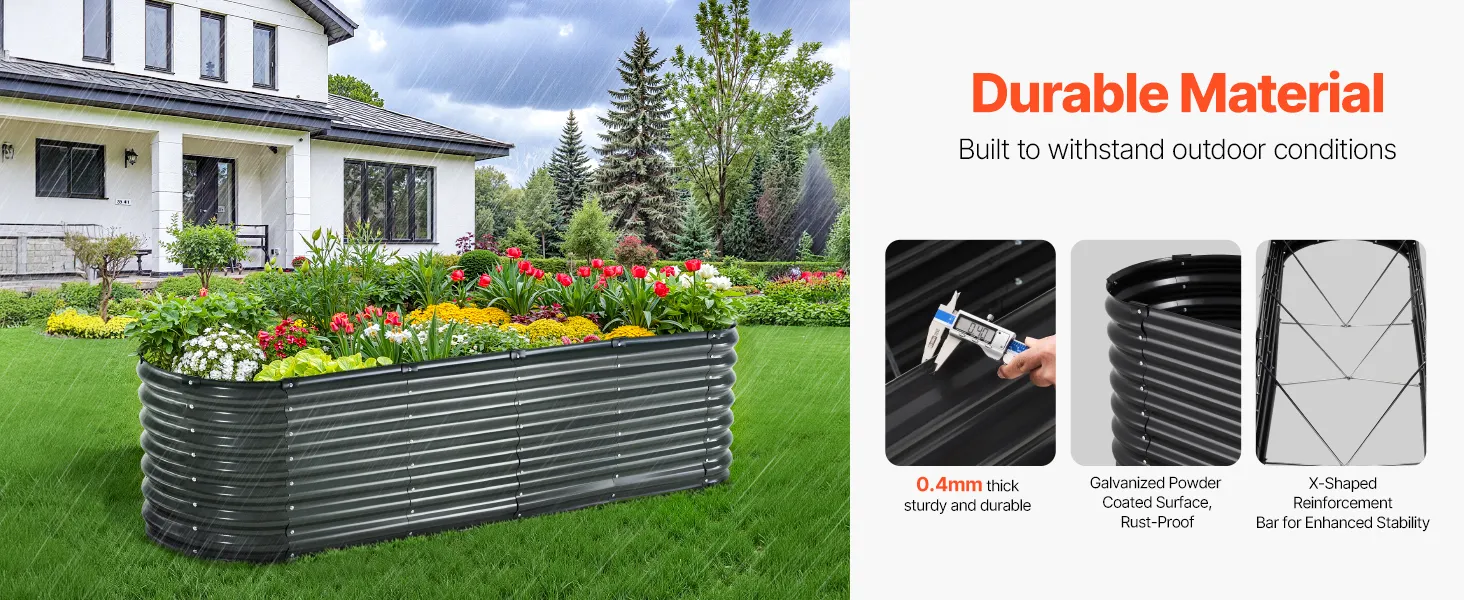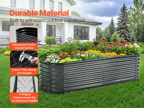 Robuust en duurzaam: dit metalen verhoogde bed is gemaakt van 0,4 mm dikke metalen zijdelen. Het oppervlak is bedekt met gegalvaniseerd poeder om roest en corrosie te voorkomen en langdurig gebruik buitenshuis te garanderen. De 12 interne X-vormige verstevigingsstaven zorgen voor extra stabiliteit en voorkomen dat het bed omvalt bij harde wind. Maak je klaar om met vertrouwen het buitenleven aan te gaan!