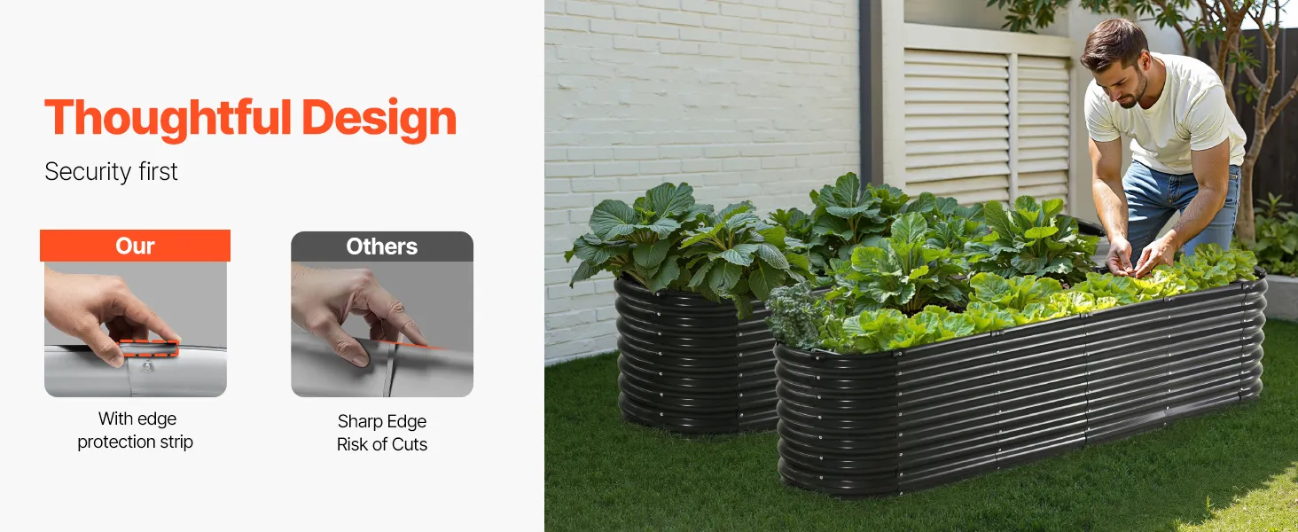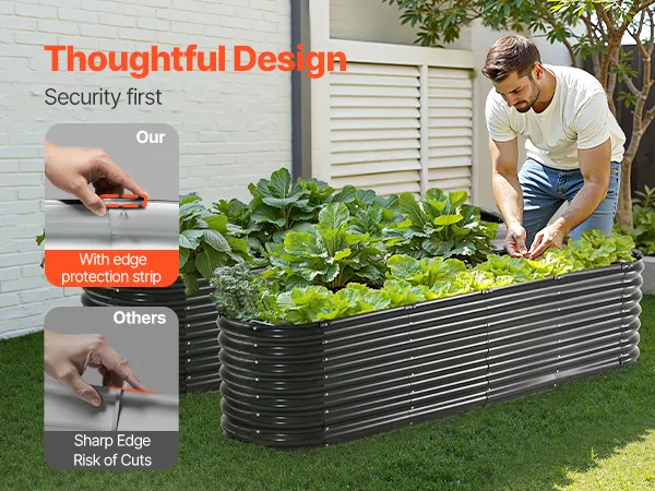 Veilig gebruik: om uw veiligheid tijdens het gebruik te garanderen, is onze verhoogde plantenbak voorzien van opgerolde randen met randbescherming om handletsel of krassen te voorkomen. Gebruik hem met een gerust hart en geniet van moeiteloos tuinieren.
