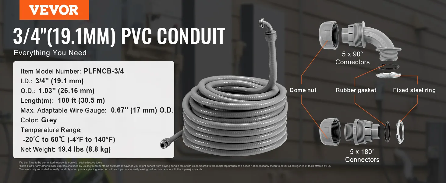 VEVOR 19,1 mm elektrische flexibele slang, 30,5 m, vloeistofdichte PVC-buis, met 5 rechte en 5 90-graden buiskoppelingen, voor airconditioningmotorregelpomp, IP65