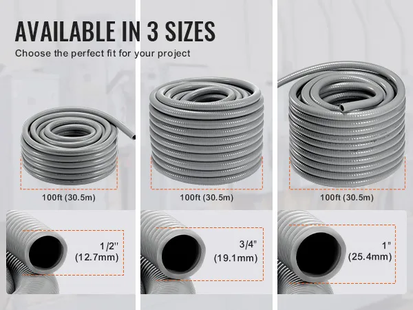 Wij bieden onze flexibele elektrische leiding van 30 meter aan in drie handige maten: 12,7 mm, 19,1 mm en 25,4 mm. Deze verscheidenheid zorgt ervoor dat u de perfecte oplossing vindt voor uw specifieke projectbehoeften.
