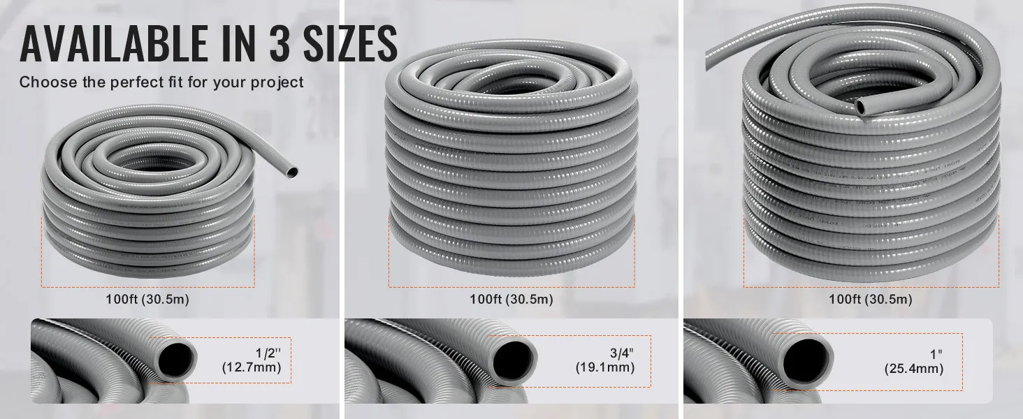 VOLLEDIGE ACCESSOIRES INBEGREPEN: Onze flexibele elektrische leiding van 100 ft (30,5 m) wordt geleverd met 5 x rechte connectoren en 5 x 90 graden connectoren, waardoor aanpasbaarheid aan verschillende toepassingen wordt gegarandeerd. Alle componenten zijn getest volgens UL-normen. Om aan verschillende projectbehoeften te voldoen, bieden we drie handige formaten: 1/2" (12,7 mm), 3/4" (19,1 mm) en 1" (25,4 mm). Kies de perfecte pasvorm voor uw specifieke behoeften!