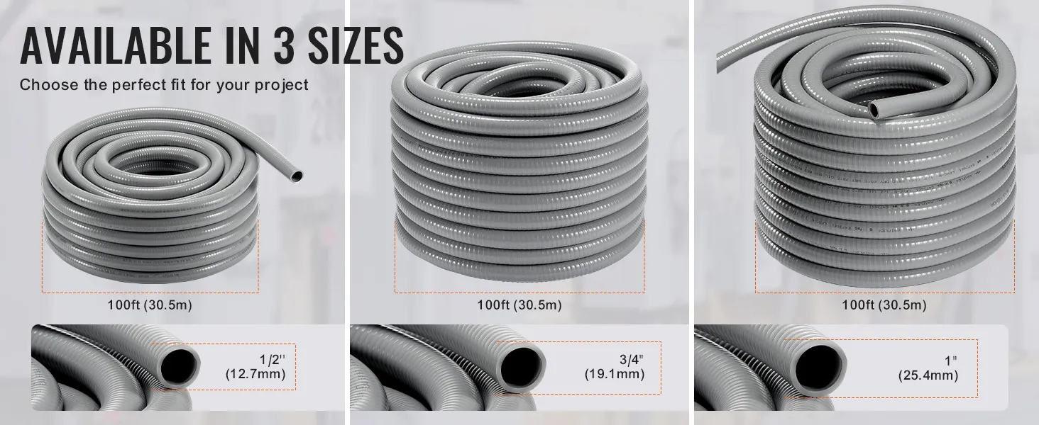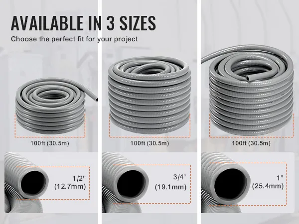 VOLLEDIGE ACCESSOIRES INBEGREPEN: Onze 30 meter lange flexibele elektrische leiding wordt geleverd met 5 x rechte connectoren en 5 x 90 graden connectoren, waardoor aanpasbaarheid aan verschillende toepassingen wordt gegarandeerd. Om aan verschillende projectbehoeften te voldoen, bieden we drie handige formaten: 1/2" (12,7 mm), 3/4" (19,1 mm) en 1" (25,4 mm). Kies de perfecte pasvorm voor uw specifieke behoeften!