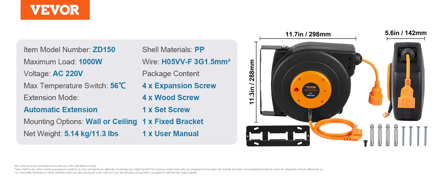 VEVOR intrekbare verlengsnoerhaspel, 15 m, 1000 W, robuuste intrekbare stroomkabel met 1 m stroomkabel, oververhittingsbeveiliging, PP-behuizing, 180° draaibare beugel voor plafond- of wandmontage