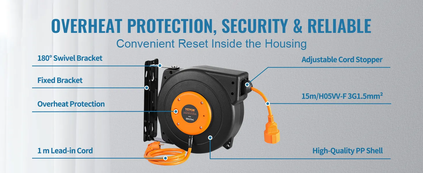 Onze kabelhaspel is voorzien van een verlengkabel van 15 meter, een voedingskabel van 1 meter, een automatisch oprolsysteem en een hoog draagvermogen van 1000 W. Blijf veilig dankzij de oververhittingsbeveiliging die de stroom automatisch uitschakelt bij 56°C.