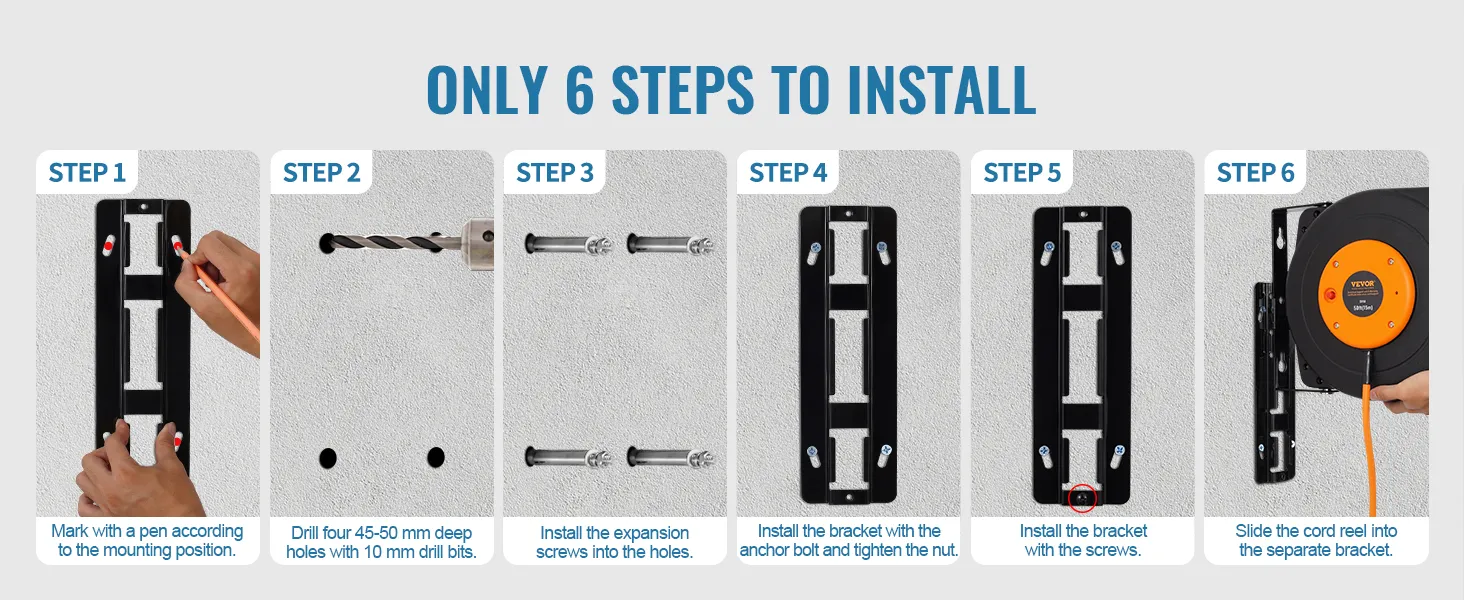 VEELZIJDIG EN GEBRUIKSVRIENDELIJK: Deze intrekbare kabelhaspel is ontworpen voor eenvoudige montage aan muren of plafonds en is voorzien van een 180° draaibare beugel voor moeiteloze toegang vanuit elke richting. Geniet van het gemak van het soepel uit- en intrekken van de kabel, terwijl u uw werkruimte overzichtelijk houdt en vrij van klitten en struikelgevaar.