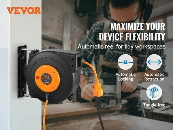 VEVOR intrekbare verlengsnoerhaspel, 15 m, 1600 W, robuuste intrekbare stroomkabel met 1 m stroomkabel, oververhittingsbeveiliging, PP-behuizing, 180° draaibare beugel voor plafond- of wandmontage