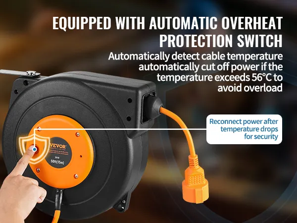 Oververhittingsbeveiliging voor gemoedsrust: Bescherm uw gereedschap en uw werkplek met onze oververhittingsbeveiliging. Onze intrekbare verlengkabelhaspel heeft een ingebouwde thermische schakelaar en schakelt automatisch de stroom uit wanneer de temperatuur boven de 56°C komt. Dit voorkomt oververhitting en mogelijke schade. Geniet van zorgeloos gebruik en meer gemoedsrust.