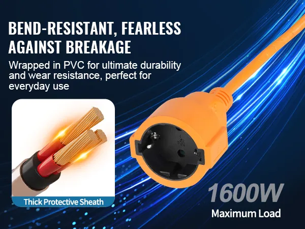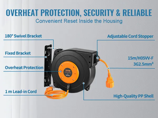 Onze kabelhaspel is voorzien van een verlengkabel van 15 meter, een voedingskabel van 1 meter, een automatisch oprolsysteem en een hoog draagvermogen van 1600 W. Blijf veilig dankzij de oververhittingsbeveiliging die de stroom automatisch uitschakelt bij 56°C.
