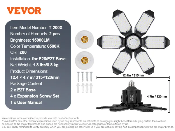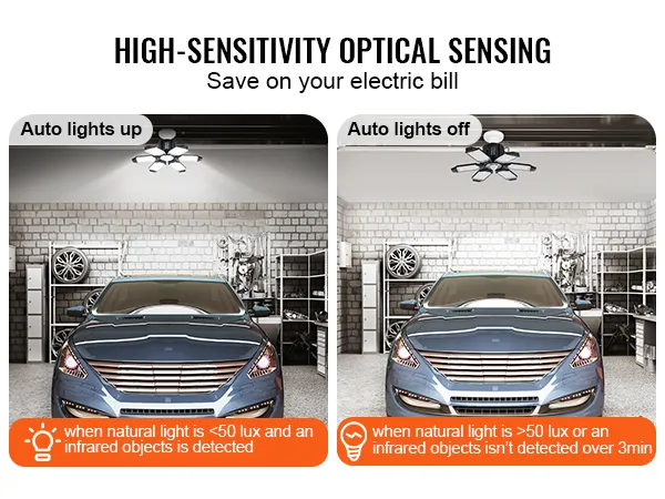 This LED garage light delivers 15000 lm with a 6500K color temperature, mimicking daylight. With a CRI of ≥80, it ensures true-to-life color rendering. The 6 adjustable panels provide 360 degree lighting, fully covering your garage. Ideal for garages, warehouses, workshops, basements, etc.