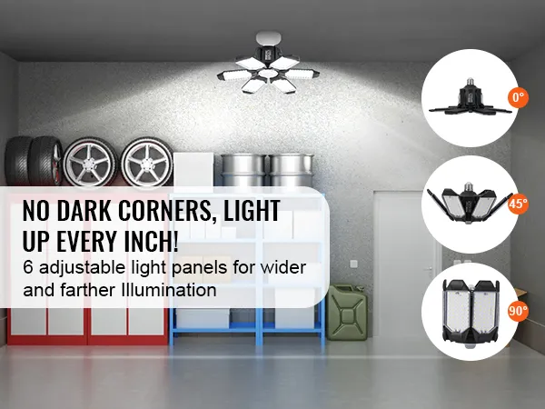 360 Degree Coverage, No Dark Corners: This light comes with 6 adjustable panels, letting you point the light exactly where you need it. Each panel tilts up to 90 degrees, so you can flood every inch of your garage or workshop with light, covering all the nooks and crannies.