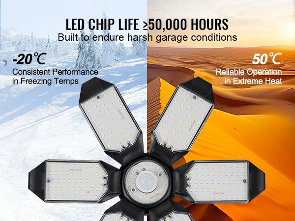 With a working temperature range of -20℃ to 50℃, this led garage light can withstand the harshest garage environments. The LED chip lifespan exceeds 50,000 hours, reducing the need for frequent replacements.