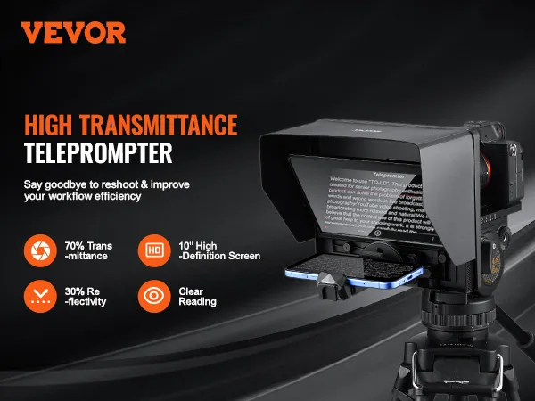 HD Easy-to-Read Screen: This teleprompter is equipped with an 8.8 in/22.35 cm spectroscope with 30% reflectivity and 70% high light transmittance, which can reflect the script clearly and support a reading distance of up to 6.5 ft/1.98 m.