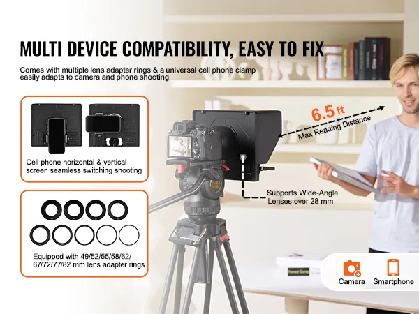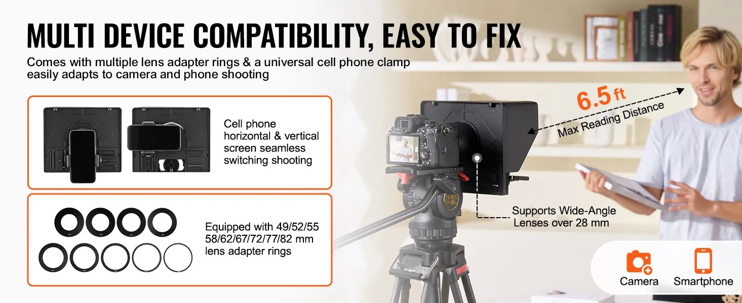Comes with a multi size lens adapter ring and a universal phone clamp, making the teleprompter easy to adapt to camera and phone shooting, and supporting effortless switching between phone horizontal and vertical screens. Supports lenses with a focal length of 28 mm or more.