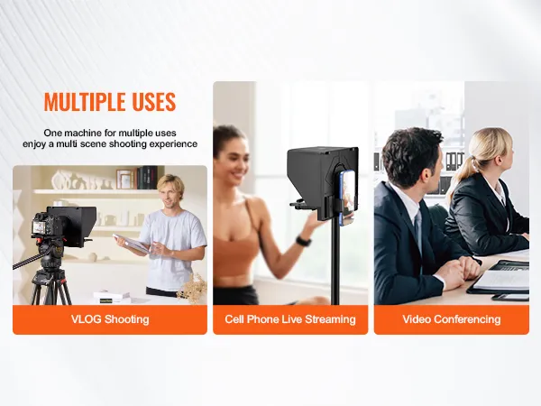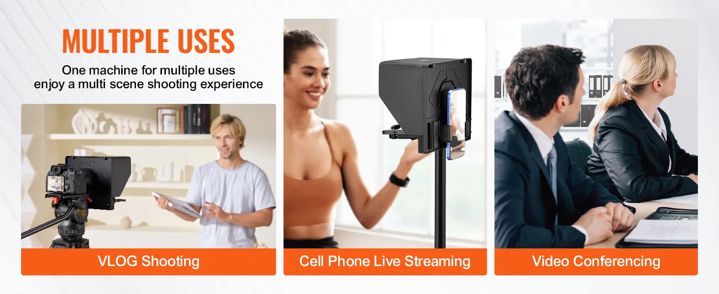 Wide Compatibility: Compatible with smartphones and tablets up to 10 in/25.4 cm, supporting Android and iOS. Ideal for teleprompter use in mobile live streaming, VLOGs, video conferencing, and platforms like YouTube, Twitch, and Zoom. Supports DSLR, webcam, and smartphone setups with wide-angle lenses over 24 mm.