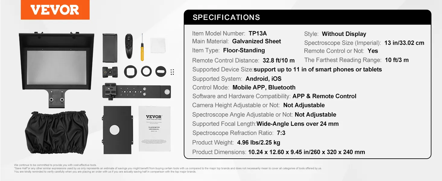 VEVOR Teleprompter, 13" Aluminum Alloy, Floor Type with Adjustable Angle Spectroscope, Remote Control, for YouTube, Twitch, Zoom, Supports DSLR/Webcam/Smartphone, for Video Recording/Live Streaming
