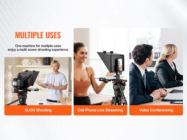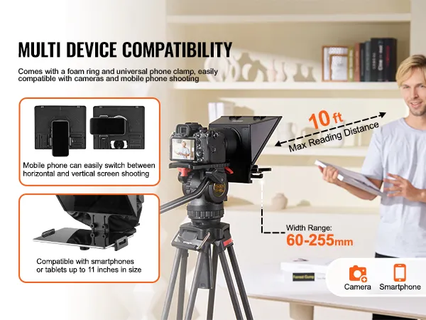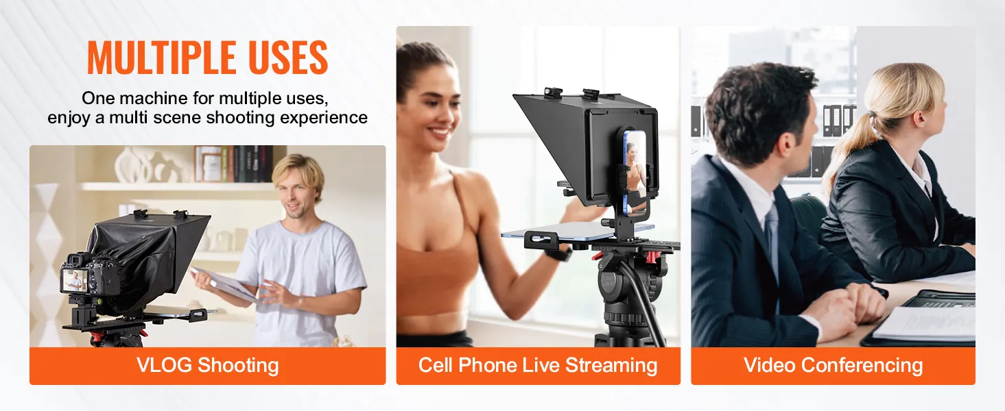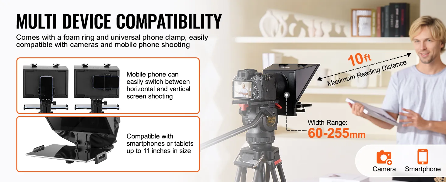 Wide Compatibility: Compatible with smartphones and tablets up to 11 in/27.94 cm, supporting Android and iOS. Ideal for teleprompter use in mobile live streaming, VLOGs, video conferencing, and platforms like YouTube, Twitch, and Zoom. Supports DSLR, webcam, and smartphone setups with wide-angle lenses over 24 mm.
