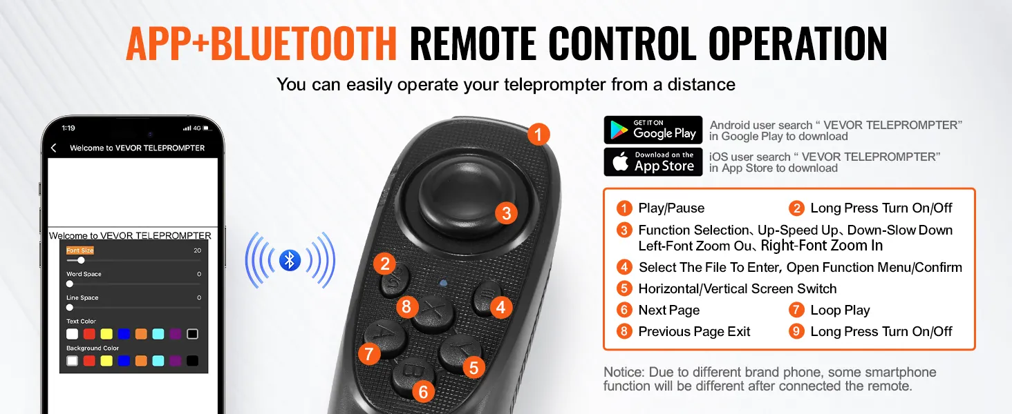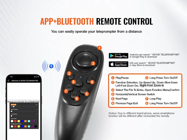 Remote Control: You can download the professional teleprompter APP, or connect the remote control via Bluetooth to realize remote control functions, the teleprompter supports fast page turning, pause and adjust the playback speed, making it more convenient and efficient.