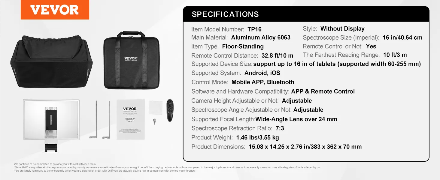 VEVOR Teleprompter, 16" Aluminum Alloy, Floor Type with Adjustable Angle Spectroscope, Remote Control, for YouTube, Twitch, Zoom, Supports DSLR/Webcam, for Video Recording/Live Streaming