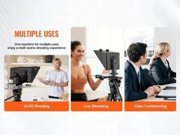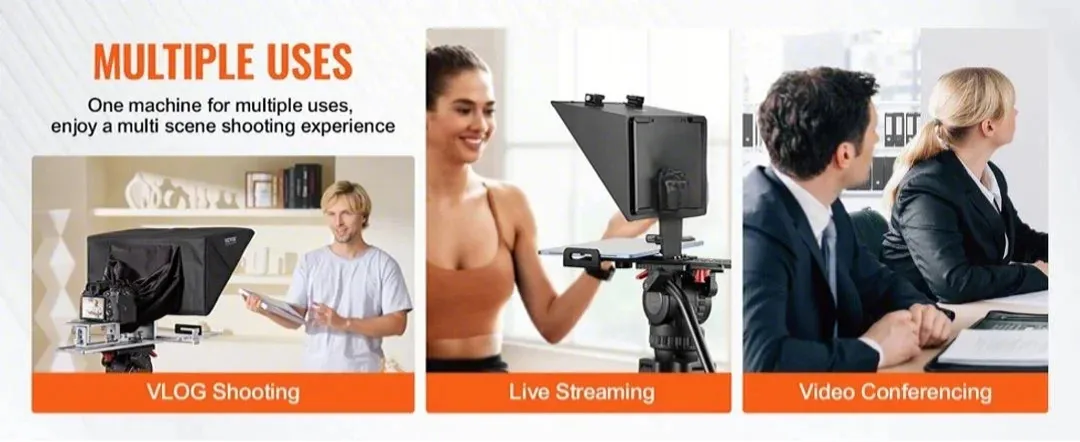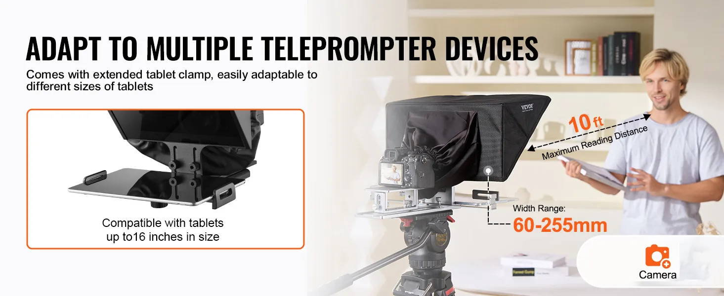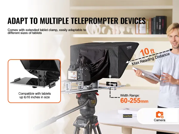 Wide Compatibility: Compatible with tablets up to 16 in/40.64 cm, supporting Android and iOS. Ideal for teleprompter use in mobile live streaming, VLOGs, video conferencing, and platforms like YouTube, Twitch, and Zoom. Supports DSLR and webcam setups with wide-angle lenses over 24 mm.