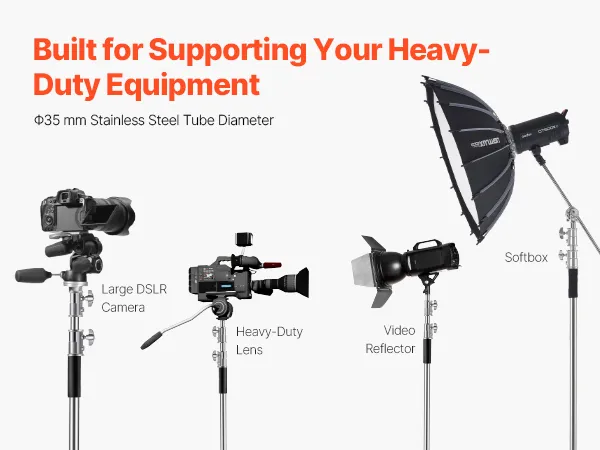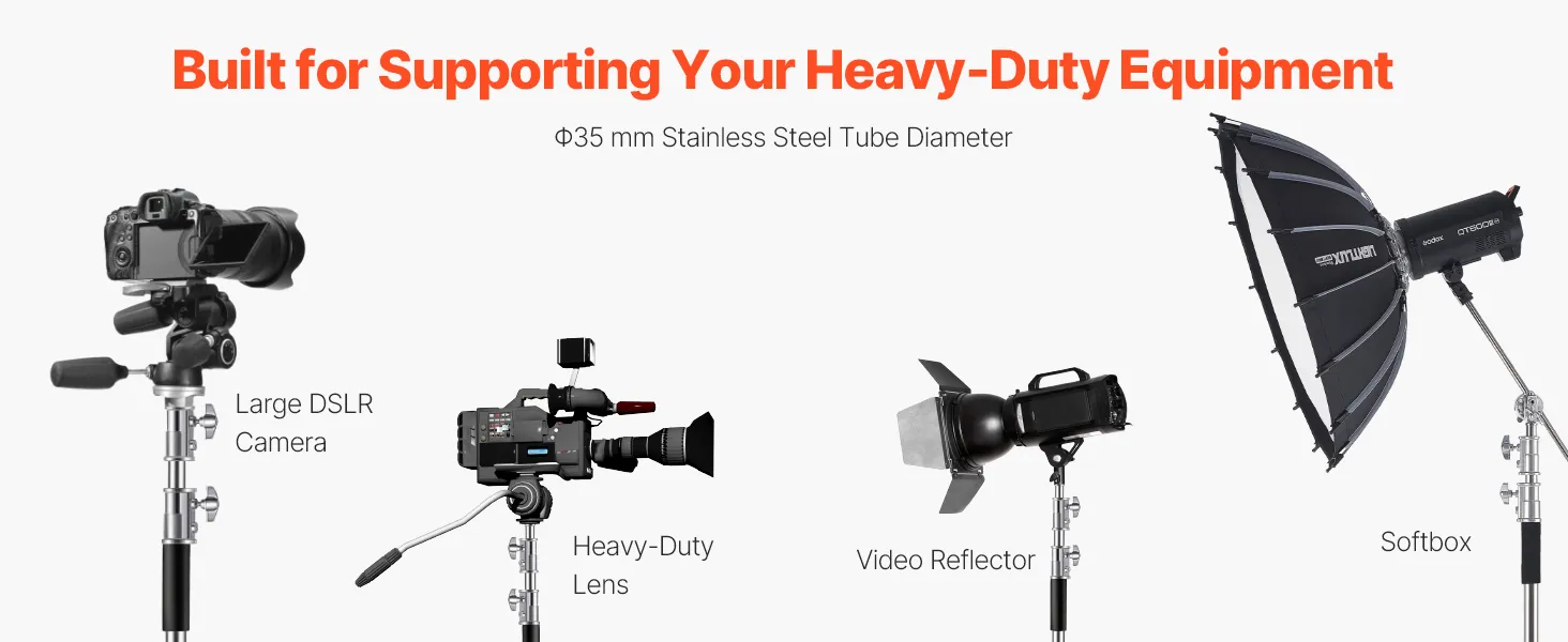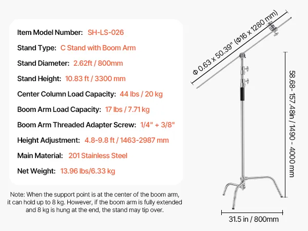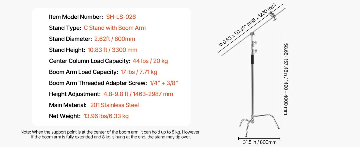 Maximum Load Capacity of 44 lbs: Crafted from durable stainless steel, this heavy duty light stand is designed to support heavy equipment with a 44 lbs (20 kg) center column load capacity and 17 lbs (8 kg) boom arm load capacity. Its corrosion-resistant stainless steel structure can withstand humidity, high temperatures, and impacts