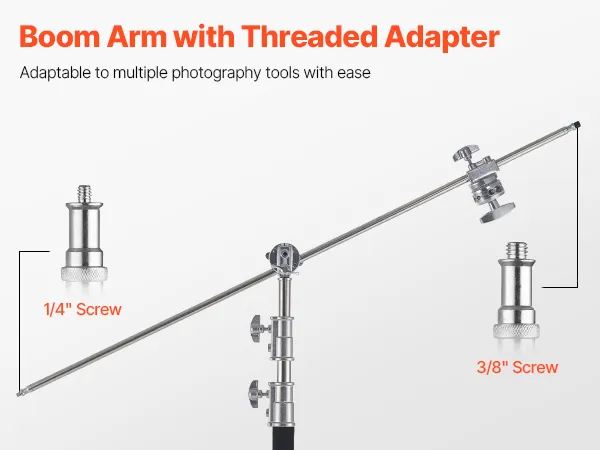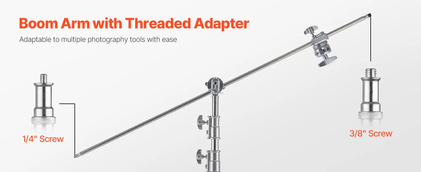 Compatible with Various Photography Gear: The center column features a universal adapter, and the boom arm includes both 1/4 in and 3/8 in threaded adapter. This ensures compatibility with most photography devices, such as studio video reflectors, softboxes, overhead rigs, and single lights