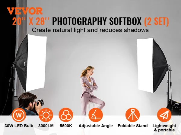 Zachte en uniforme lichtbundel: 20 x 28 inch / 500 x 700 mm softbox-verlichtingsset met 30 W energiebesparende LED-verlichting, 3000 lm hoge helderheid. Meerlaagse reflecterende lagen verzachten het licht effectief en zorgen voor een meer uniforme verlichting. Ze verwijderen ook schaduwen, zorgen ervoor dat details duidelijk worden weergegeven en zorgen voor een betere opname-ervaring, waardoor uw beelden natuurlijker en levendiger worden.