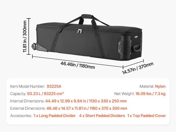 VEVOR Studio Equipment Trolley Case, 46.46 x 14.57 x 11.81 in / 118 x 37 x 30 cm, Rolling Camera Bag, Carrying Bag with Wheels Straps Padded Compartment Handle, for Light Stands, Tripods, Telescopes