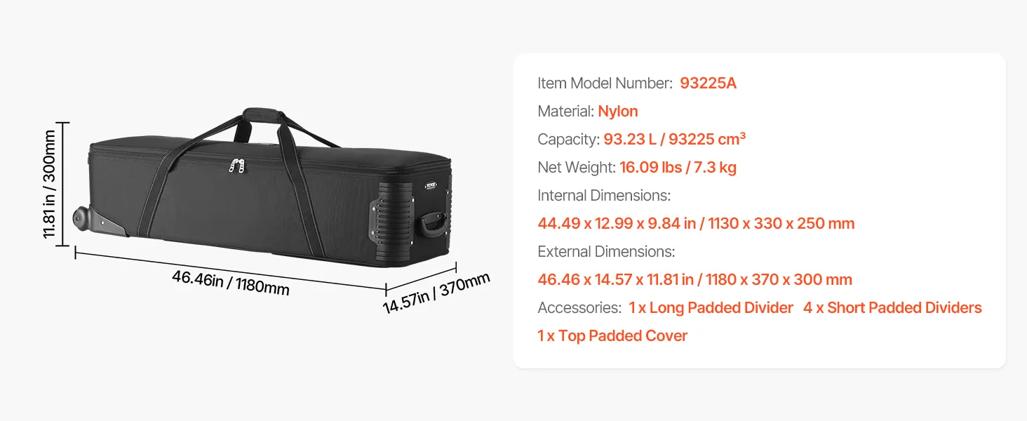 93.23 L / 93225 cm³ Large Capacity: Our studio equipment trolley case provides a spacious main compartment room to store a variety of photography equipment and accessories, including telescopes, flash units, LED video lights, tripods, microphone stands, and more