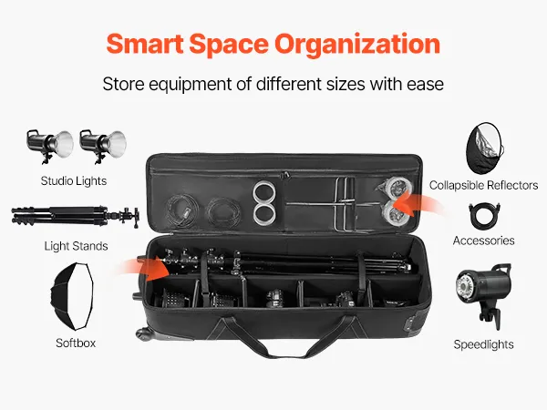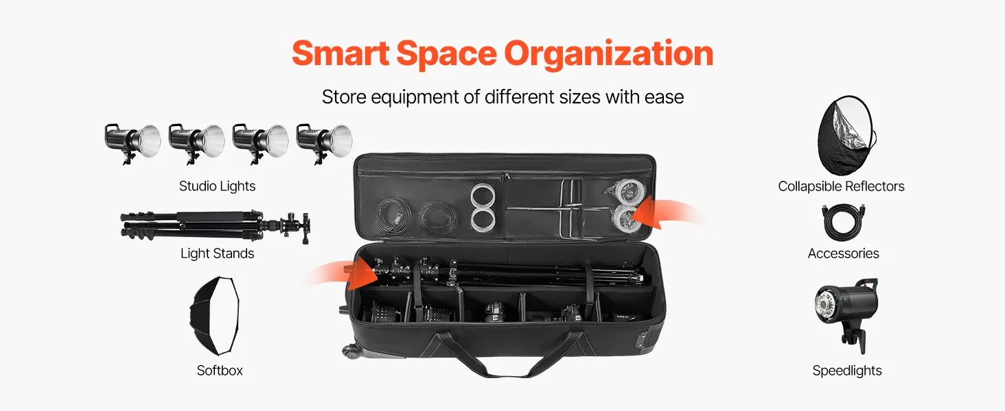 Specifically designed to accommodate various sizes of camera gear, our studio trolley case easily stores Studio Lights, Light Stands, Soft Light Umbrellas, and Collapsible Reflectors. It is the ideal companion for photographers.