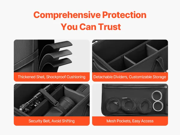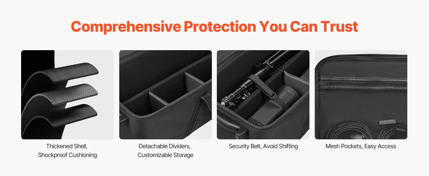 Flexible & Customizable Storage: The detachable padded dividers create customizable storage space for accessories of all sizes. Mesh pockets are ideal for organizing small items, while secure straps keep your equipment firmly in place during transport