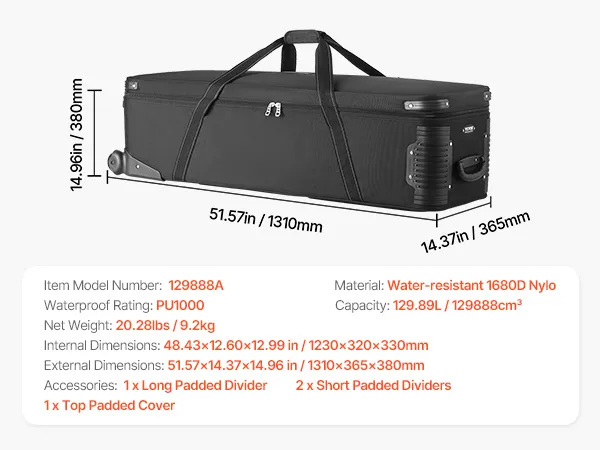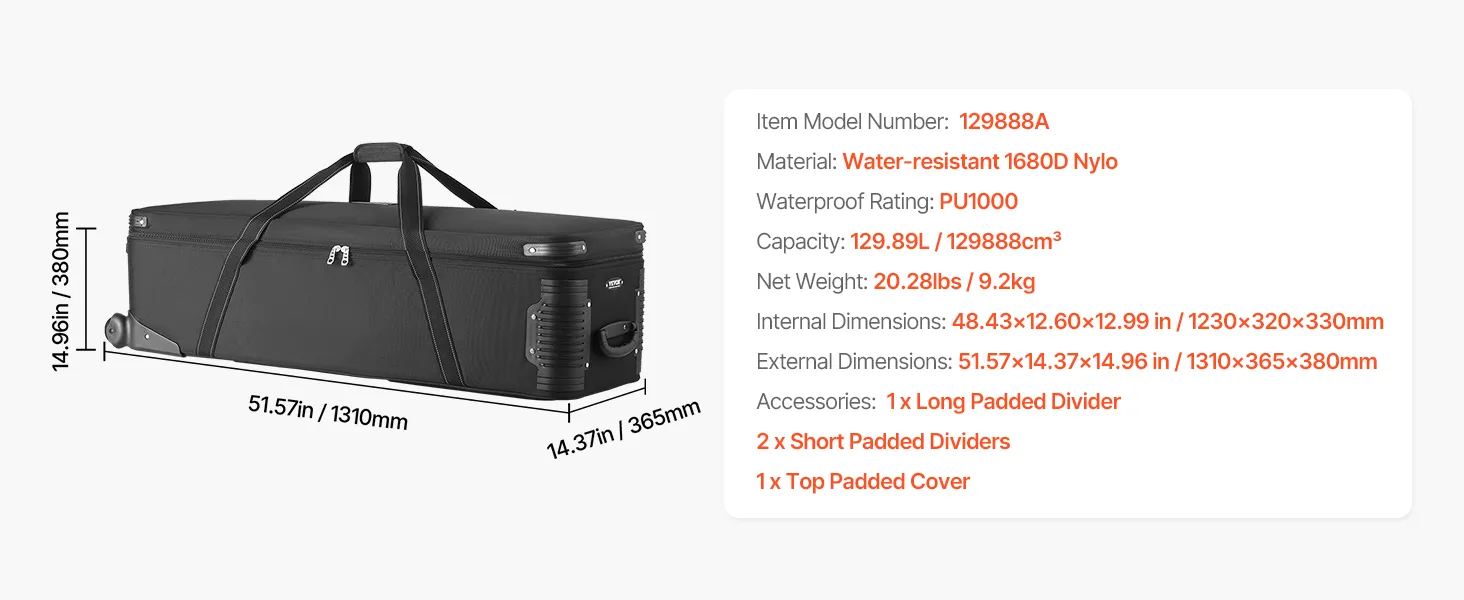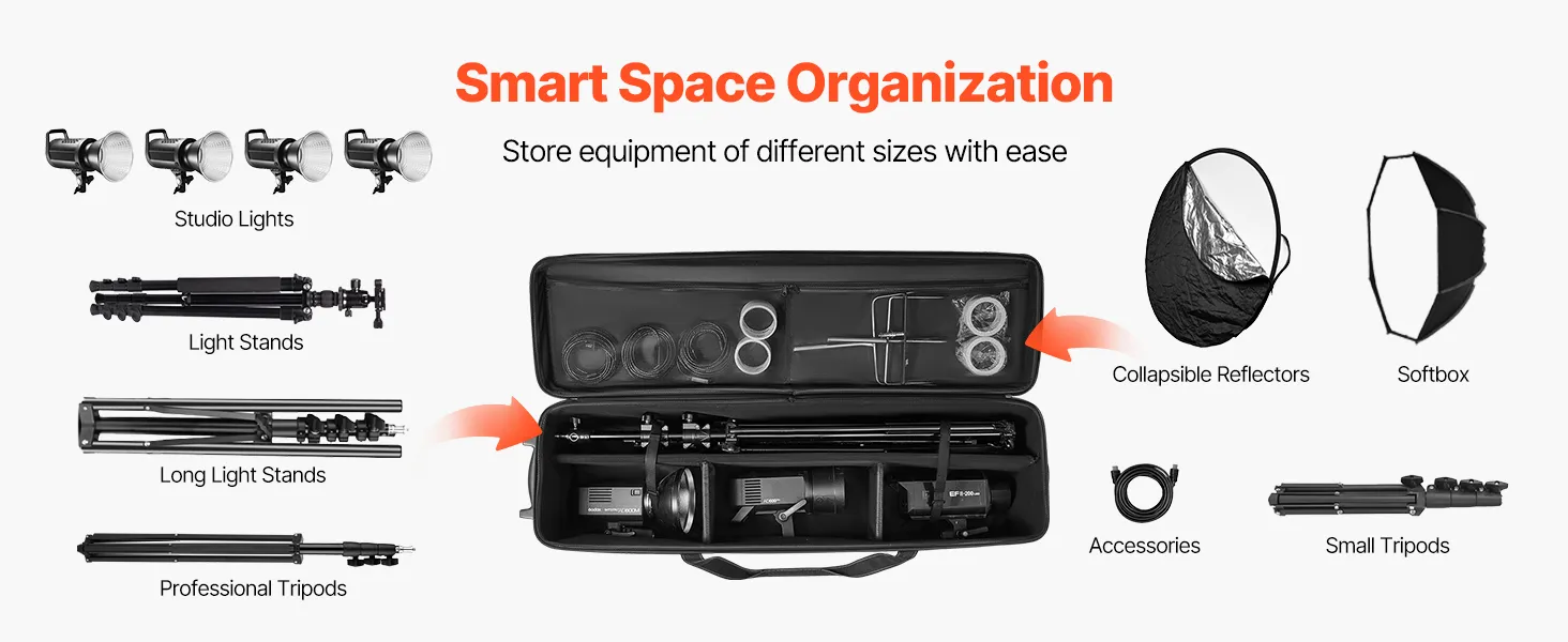 129.89 L / 129888 cm³ Large Capacity: Our studio equipment trolley case provides a spacious main compartment room to store a variety of photography equipment and accessories, including telescopes, flash units, LED video lights, tripods, microphone stands, and more