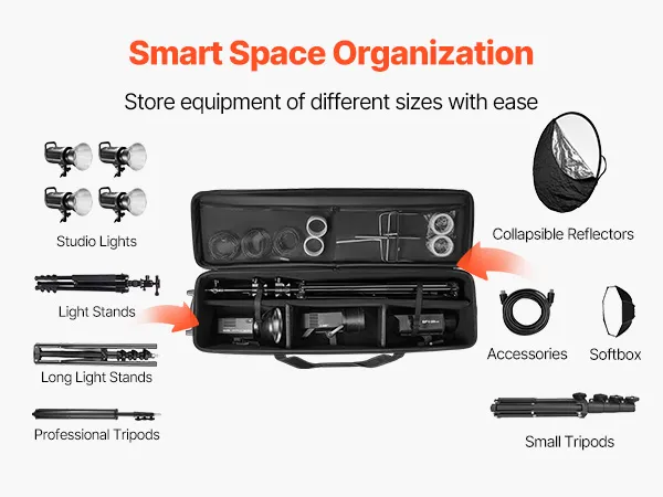 Specifically designed to accommodate various sizes of camera gear, our studio trolley case easily stores Studio Lights, Light Stands, Soft Light Umbrellas, and Collapsible Reflectors. It is the ideal companion for photographers.