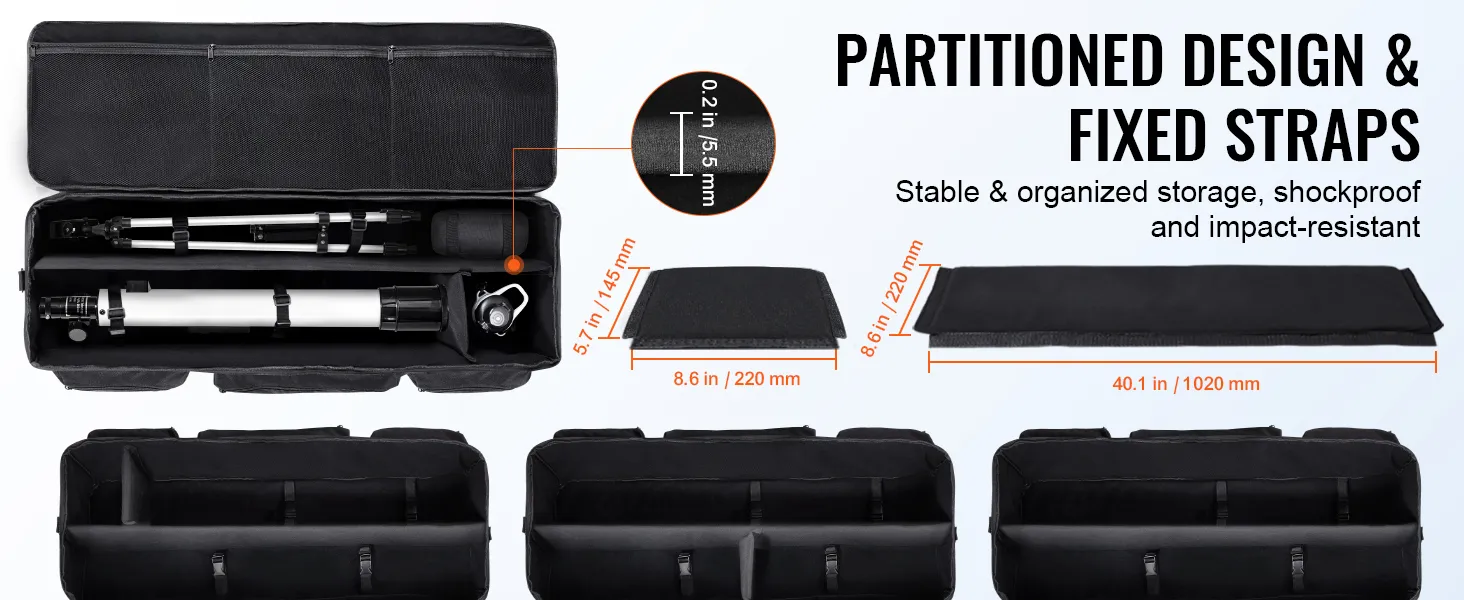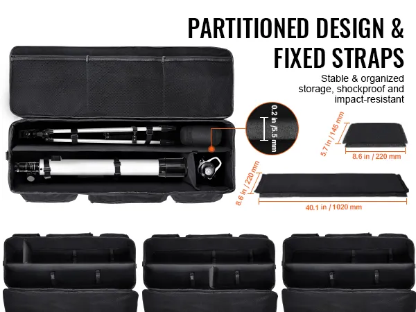 Versatile Storage Options: 2 detachable dividers of 0.2''/5.5 mm thickness not only realize the flexibility of space layout, but also greatly enhance the efficiency of storage. And with good cushioning performance, the telescope bag can effectively withstand external impact and extrusion, so as to avoid collision and damage with other components.