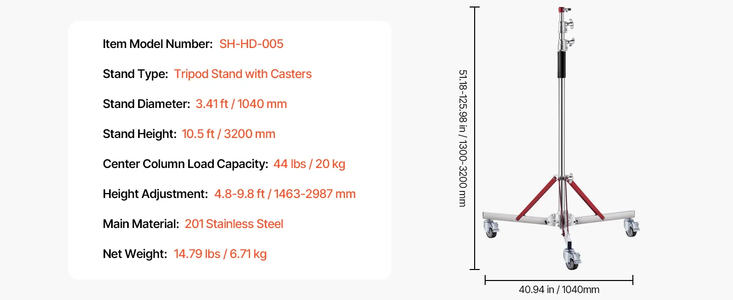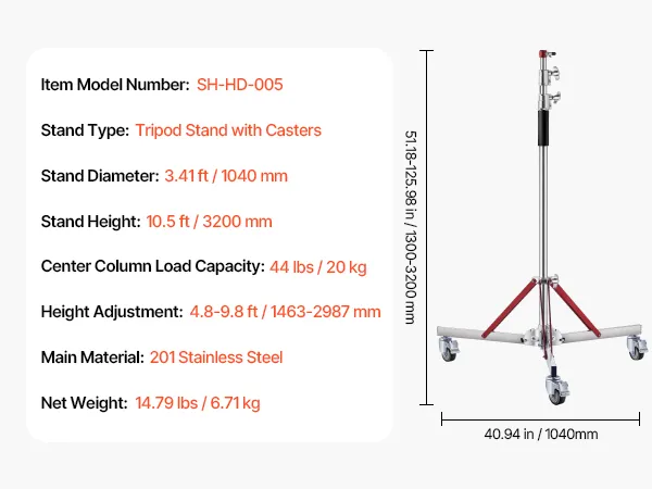 Maximum Load Capacity of 44 lbs: Crafted from durable stainless steel, this photography wheeled base stand is designed to support heavy equipment with a maximum load capacity of 44 lbs (20 kg). Its corrosion-resistant structure can withstand humidity, high temperatures, and impacts
