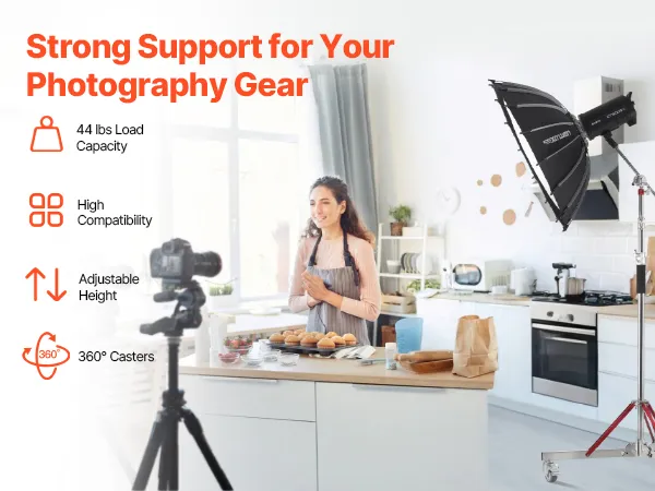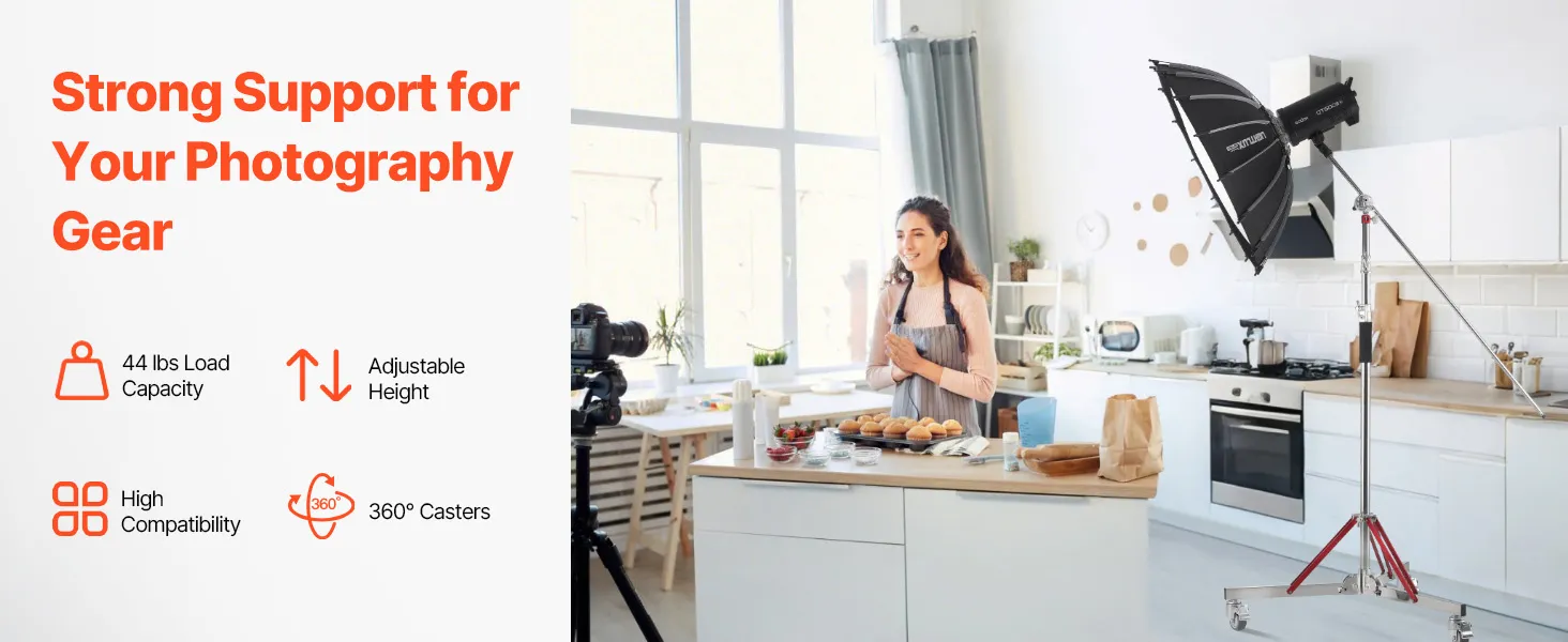 This light stand with casters features a standard universal adapter and 44 lbs load capacity, supporting video reflectors, softboxes, and more with ease. With 4.8 ft to 9.8 ft adjustable height and 360° rotating casters, it allows for customizable angles to suit any shoot and easy movement.