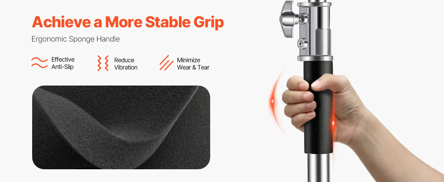 Featuring an ergonomic sponge handle, this heavy duty light stand with casters provides a secure and comfortable grip, improving stability during use. The non-slip design helps reduce vibrations and wear, ensuring a smooth user experience, even during long shooting sessions.
