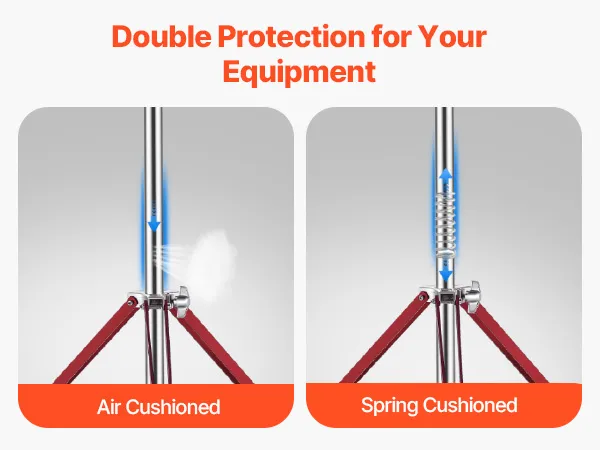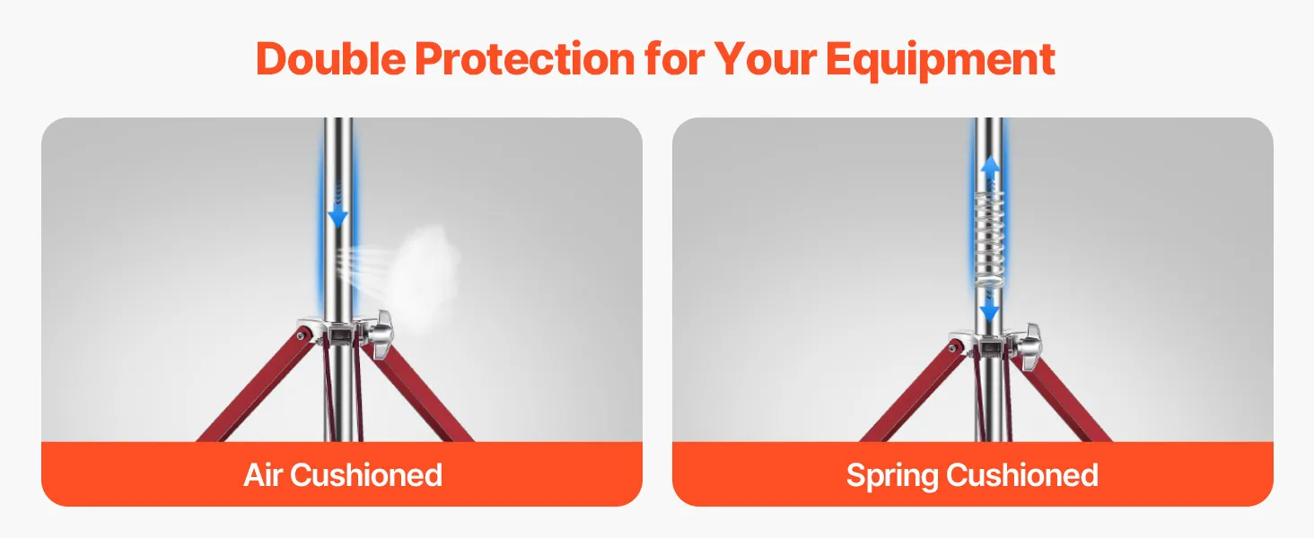 Adjustable Height for Every Shot: Featuring a 3-stage column design, our adjustable tripod stand provides an adjustable height range from 4.8 ft to 9.8 ft (1463 mm to 2987 mm), allowing for ideal positioning. The spiral locks ensure your equipment stays securely in place, while the air and spring cushioning effectively reduce vibrations for extra stability and shock absorption