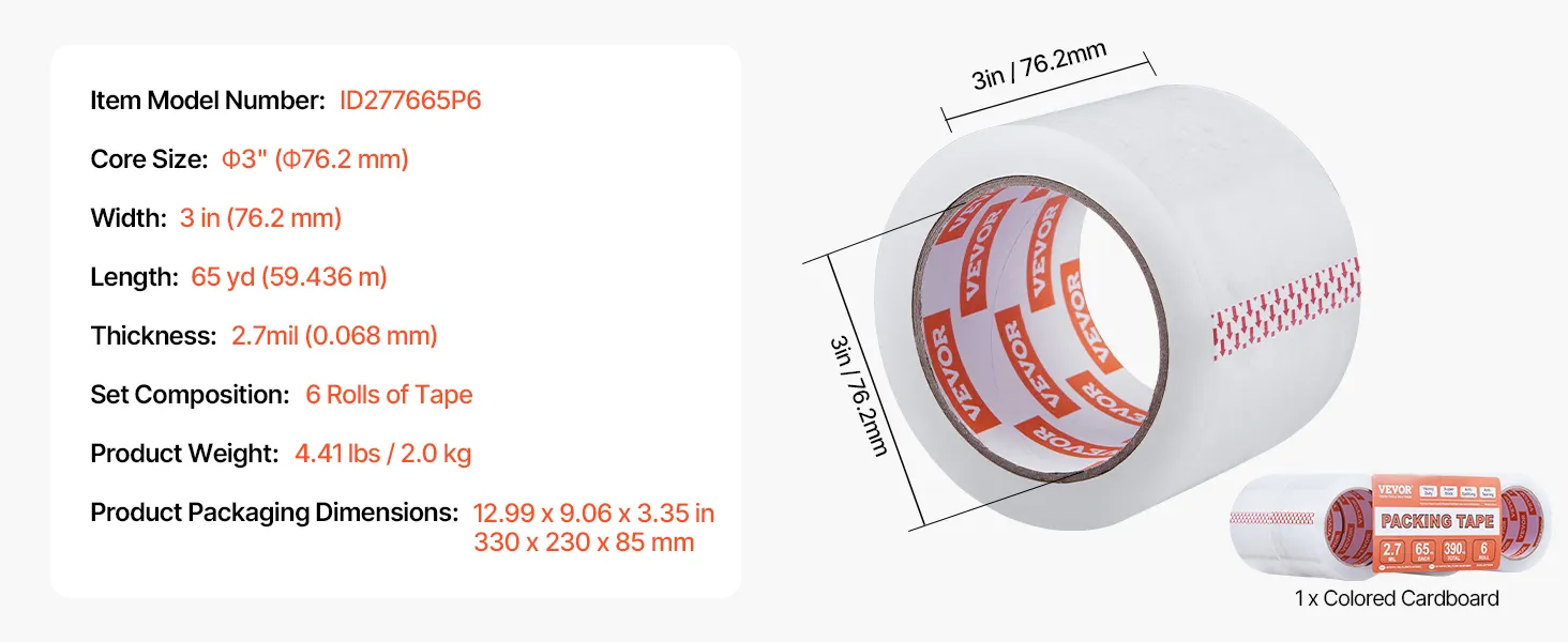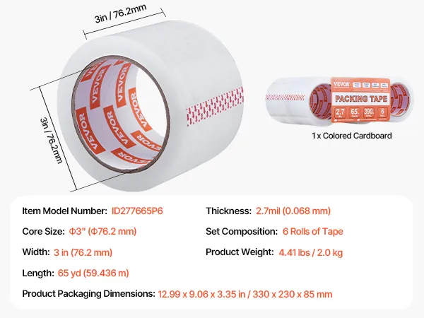 VEVOR Clear Packing Tape, 3 inches Core, 6 Rolls 3 Inches x 65 Yards Packing Tapes, 2.7 Mil Thick, Heavy Duty Packaging Tape Designed for Moving, Storage and Packing, Shipping and Mailing, Office