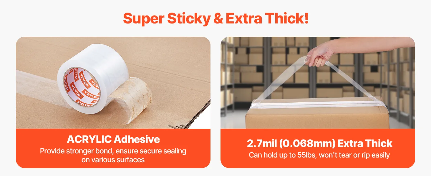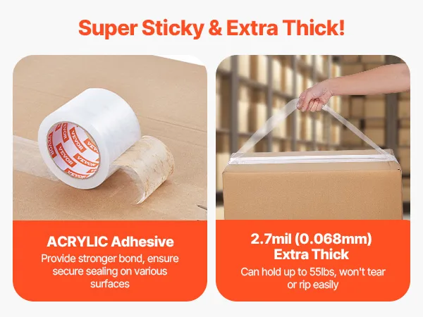 Premium Adhesive: Our heavy duty packing tape uses water-based acrylic adhesive, not solvent or hot-melt glue, and is free of formaldehyde. It bonds instantly to boxes, creating a durable, long-lasting seal that withstands extreme conditions like high or low temperatures, ensuring secure storage and shipping.