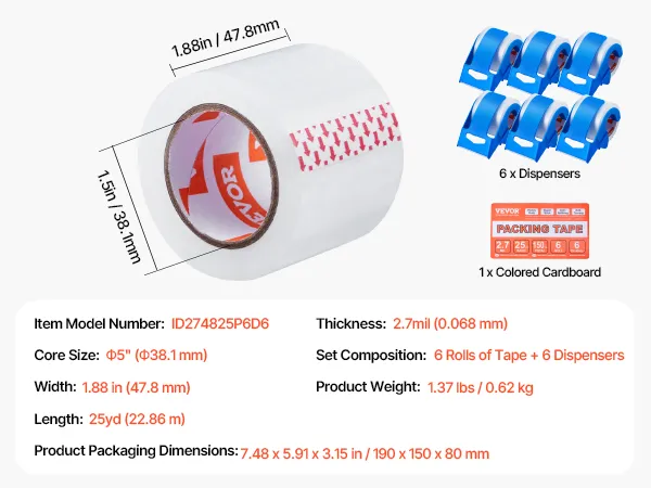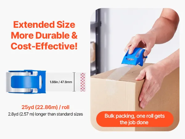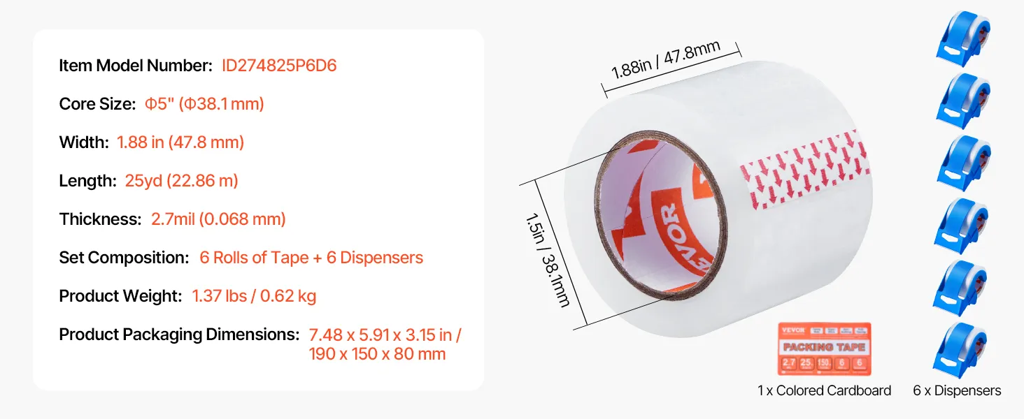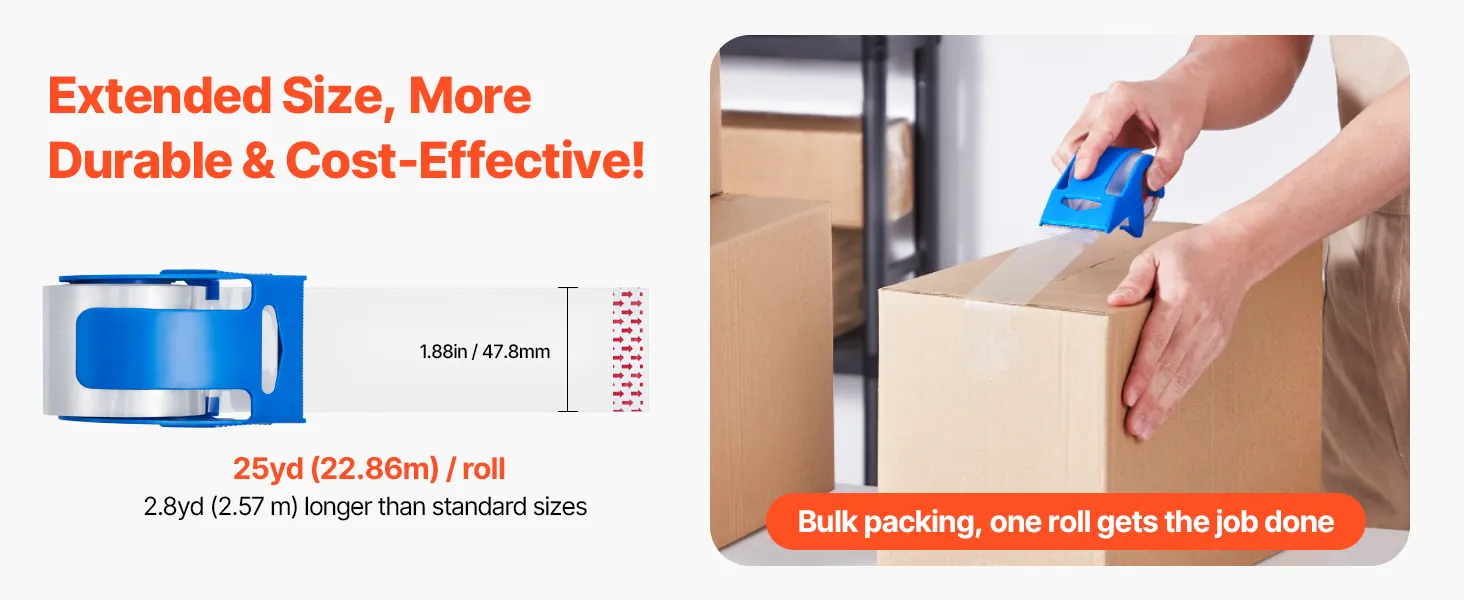 Onze kosteneffectieve transparante tapeset bevat 6 rollen 38,1 mm kerntape, elk 25 yd / 22,86 m lang. Dat is 2,8 yd / 2,57 m langer dan traditionele tape, wat u een duurzamere, kosteneffectievere oplossing biedt voor uw verpakkingsbehoeften.